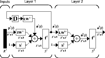 Следующая динамическая сеть, которая должна быть введена, - это повторяющаяся сеть уровня (LRN). Более ранняя упрощенная версия этой сети была представлена Elman [Elma90]. В LRN имеется петля обратной связи с одной задержкой вокруг каждого уровня сети, за исключением последнего уровня. Первоначальная сеть Элмана имела только два слоя, и использовала tansig передаточная функция для скрытого слоя и purelin передаточная функция для выходного уровня. Исходную сеть Элмана обучали, используя приближение к алгоритму обратного распространения. layrecnet команда обобщает сеть Эльмана, чтобы иметь произвольное количество уровней и иметь произвольные передаточные функции в каждом уровне. Инструментарий обучает LRN с использованием точных версий алгоритмов на основе градиента, обсуждаемых в многослойных неглубоких нейронных сетях и обучении обратному распространению. На следующем рисунке показана двухуровневая сеть LRN.