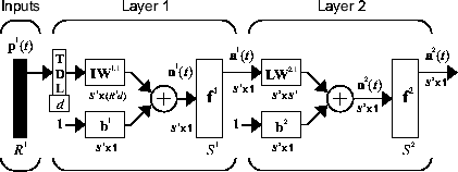 Начните с наиболее простой динамической сети, которая состоит из сети прямой связи с отводимой линией задержки на входе. Это называется сфокусированной нейронной сетью временной задержки (FTDNN). Это часть общего класса динамических сетей, называемых сфокусированными сетями, в которых динамика появляется только на входном уровне статической многослойной сети прямой связи. На следующем рисунке показана двухуровневая FTDNN.