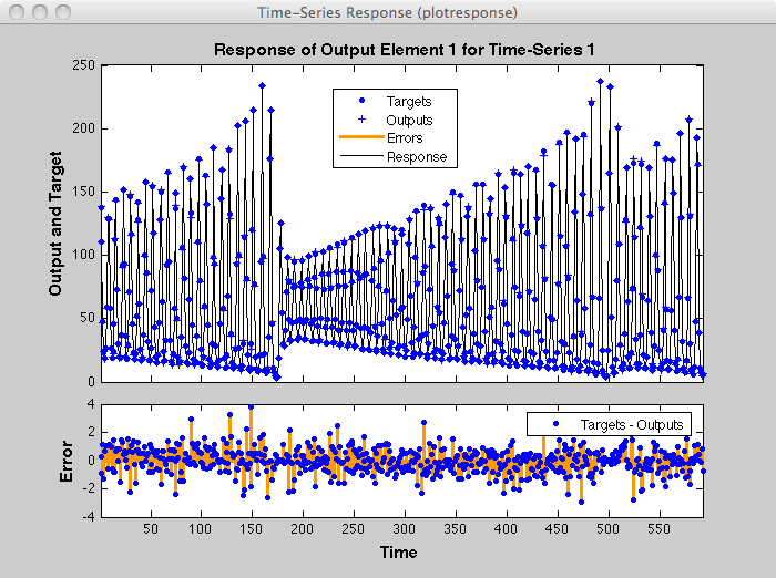 Тренировки прекратились, потому что была достигнута максимальная эпоха. В этом окне можно просмотреть отклик сети, нажав кнопку Time-Series Response. Появится следующий рисунок.