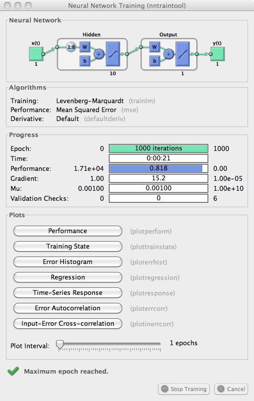 ftdnn_net = timedelaynet([1:8],10); ftdnn_net.trainParam.epochs = 1000; ftdnn_net.divideFcn = '';