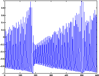 Следующий рисунок представляет собой график нормализованных данных интенсивности, записанных с дальнего инфракрасного лазера в хаотическом состоянии. Это часть одного из нескольких наборов данных, используемых для конкурса временных рядов Santa Fe [WeGe94]. В конкурсе целью было использование первых 1000 очков временного ряда для прогнозирования следующих 100 очков. Поскольку наша цель состоит просто в том, чтобы проиллюстрировать, как использовать FTDNN для прогнозирования, сеть обучена здесь выполнять прогнозы на один шаг вперед. (Можно использовать результирующую сеть для многоступенчатых прогнозов, подавая прогнозы обратно на вход сети и продолжая итерацию.)