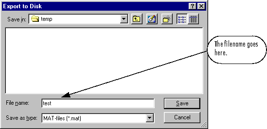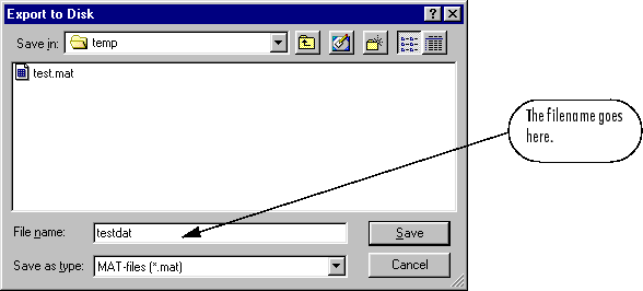 Щелкните Экспорт на диск. Откроется следующее окно. Введите имя файла testdat в поле и выберите Сохранить. Структура данных обучения сохраняется на диске.