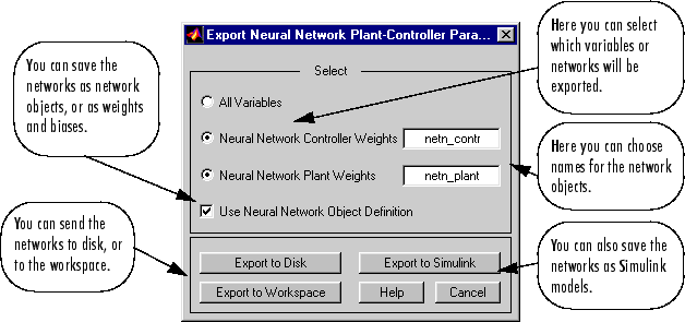 Разрабатываемые сети контроллеров и модели установок хранятся в блоках контроллеров Simulink ®. В какой-то момент может понадобиться перенести сети в другие приложения или перенести сеть из одного блока контроллера в другой. Это можно сделать с помощью опций меню Импорт сети (Import Network) и Экспорт сети (Export Network). В следующем примере рассматриваются процессы экспорта и импорта. (В этом примере используется окно NARMA-L2, но та же процедура применяется ко всем контроллерам.)