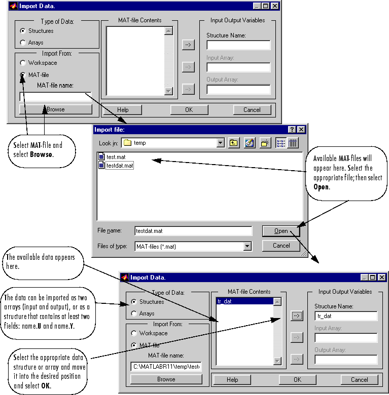 Данные, создаваемые для обучения сетей, существуют только в соответствующем окне идентификации завода или обучения контроллера. Возможно, потребуется сохранить учебные данные в рабочей области или на диске, чтобы их можно было загрузить позже. Также может потребоваться объединить наборы данных вручную и затем загрузить их обратно в окно обучения. Это можно сделать с помощью кнопок Импорт (Import) и Экспорт (Export). В следующем примере рассматриваются процессы импорта и экспорта. (В этом примере используется окно NN Predictive Control, но та же процедура применяется ко всем контроллерам.)