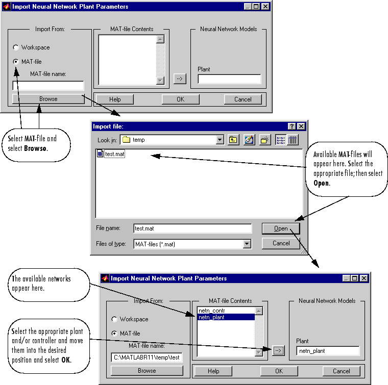 Это приводит к появлению следующего окна. Выполните указанные действия для извлечения ранее экспортированных данных. После извлечения данных их можно загрузить в блок контроллера, нажав кнопку ОК или Применить. Обратите внимание, что в окне имеется запись только для модели завода, несмотря на сохранение модели завода и контроллера. Это связано с тем, что контроллер NARMA-L2 извлекается непосредственно из модели завода, поэтому импорт обоих сетевых графиков не требуется.