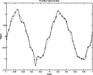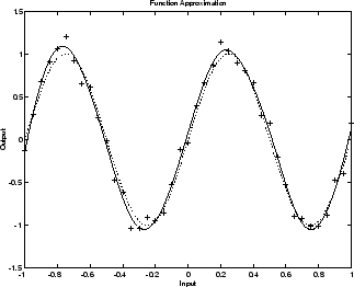 На следующем рисунке показана реакция нейронной сети 1-20-1, которая была обучена аппроксимировать шумную синусоидальную функцию. Основная синусоидальная функция показана пунктирной линией, шумные измерения даны символами +, а ответ нейронной сети - сплошной линией. Очевидно, что эта сеть перевыполнила данные и не будет хорошо обобщаться.
