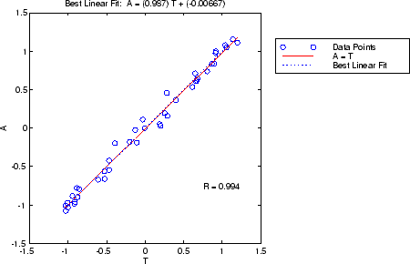 Следующий рисунок иллюстрирует графический вывод, предоставляемый regression. Сетевые выходы строятся в зависимости от целей в виде разомкнутых окружностей. Наилучшая линейная посадка обозначается пунктирной линией. Идеальная посадка (выход равен целям) обозначается сплошной линией. В этом примере трудно отличить наилучшую линейную линию посадки от идеальной линии посадки, потому что посадка такая хорошая.