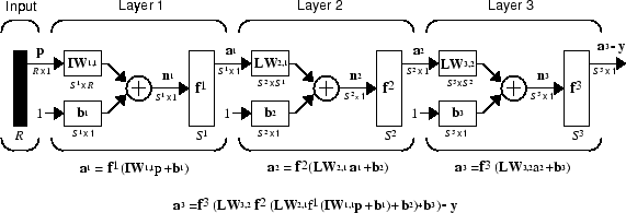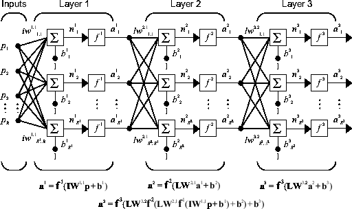 Сеть может иметь несколько уровней. Каждый слой имеет весовую матрицу W, вектор смещения b и выходной вектор A. Для различения весовых матриц, выходных векторов и т.д. для каждого из этих слоев на чертежах номер слоя добавляется в виде надстрочного индекса к интересующей переменной. Можно увидеть использование этой нотации слоя в трехслойной сети, показанной ниже, и в уравнениях в нижней части рисунка.