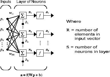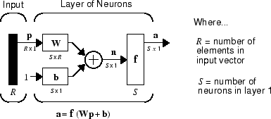 Здесь p - входной вектор R-длины, W - матрица S × R, a и b - векторы S-длины. Как определено ранее, нейронный слой включает в себя весовую матрицу, операции умножения, вектор смещения b, сумматор и блоки передаточных функций.