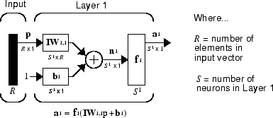 Заметим, что обычно количество входов в слой отличается от числа нейронов (то есть R не обязательно равно S). Слой не ограничен тем, чтобы количество его входов было равно числу его нейронов.