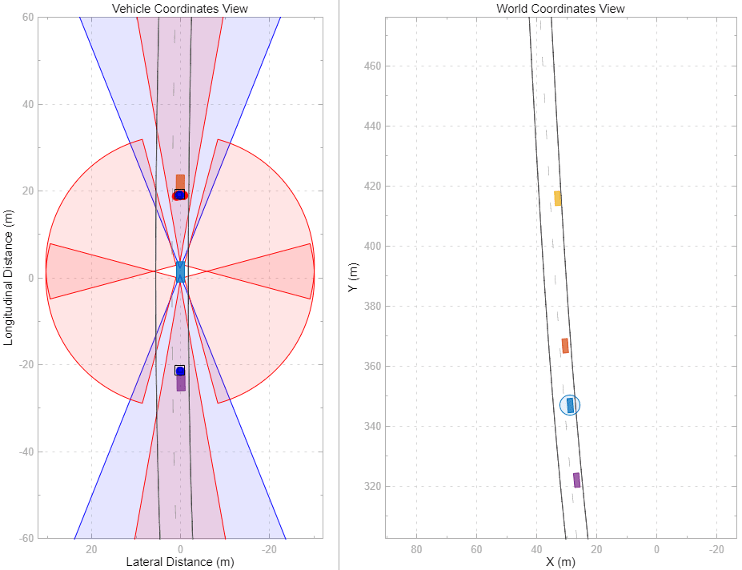 Bird 's-Eye Scope визуализирует аспекты сценария вождения, найденного в модели Simulink ® .