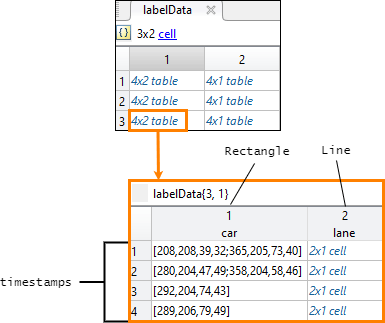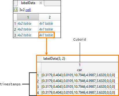 labelData выходные данные представляют собой массив ячеек 3 на 2 из таблиц. Каждая строка массива ячеек содержит данные метки для одной из groundTruthMultisignal объекты. Первый столбец содержит данные метки для видеосигнала, video_front_camera. Второй столбец содержит данные метки для сигнала последовательности облаков точек, lidarData. На этом рисунке показаны labelData массив ячеек.