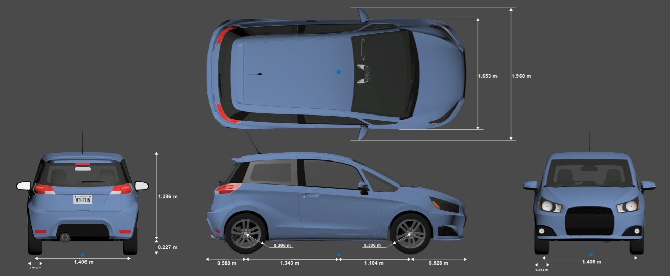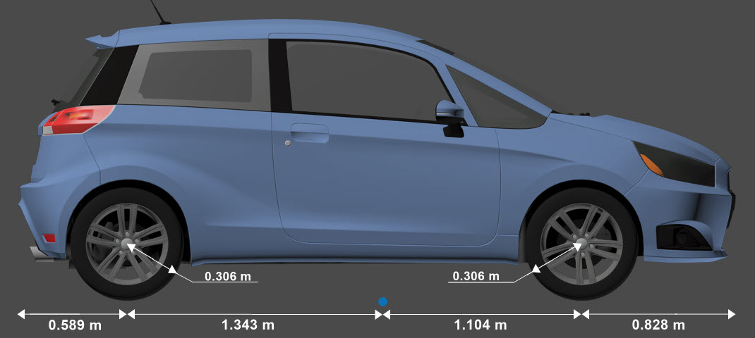 Hatchback является одним из транспортных средств, которые можно использовать в среде моделирования 3D. Эта среда визуализируется с помощью Unreal Engine ® от Epic Games ®. На диаграмме представлены размеры данного транспортного средства. Размеры по высоте соответствуют вертикальной плоскости грунта. Размеры длины и ширины соответствуют исходной точке транспортного средства в системе координат транспортного средства. Начало координат - на земле, в геометрическом центре транспортного средства. Для получения более подробной информации об этих схемах см. раздел «Размеры».