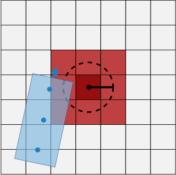 Если какая-либо центральная точка лежит на накачанной ячейке сетки, то поза транспортного средства занята. checkOccupied функция возвращает true. Занятая поза не обязательно означает столкновение. Например, транспортное средство может лежать на накачанной ячейке сетки, но не на фактически занятой ячейке сетки.