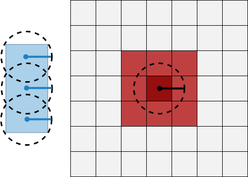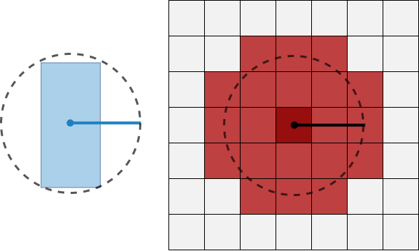 Преобразование радиуса инфляции в несколько ячеек сетки, R. Округление неинтегрированных значений R до следующего наибольшего целого числа.