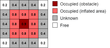 Карта затрат хранится как 2-D сетка ячеек, часто называемая сеткой занятости или картой занятости. Каждая ячейка сетки в карте затрат имеет значение в диапазоне [0, 1], представляющее стоимость навигации по этой ячейке сетки. Состояние каждой ячейки сетки свободно, занято или неизвестно, как определено FreeThreshold и OccupiedThreshold свойства.