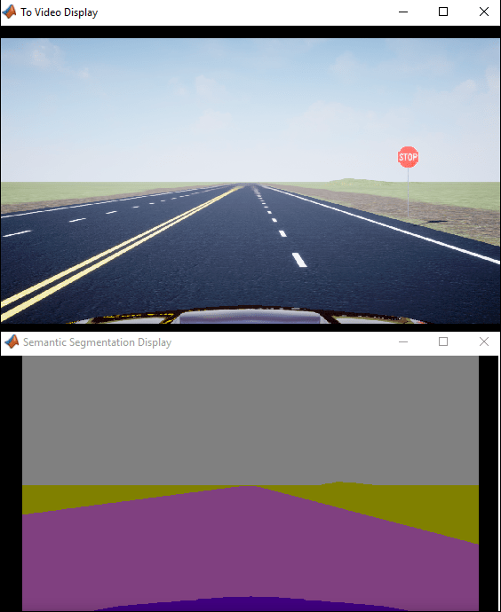 Например, в окне «На видео» отображается знак остановки, добавленный в пользовательскую сцену. В окне Отображение семантической сегментации (Semantic Segmentation Display) не отображается знак остановки, поскольку в знаке остановки отсутствует идентификатор шаблона.