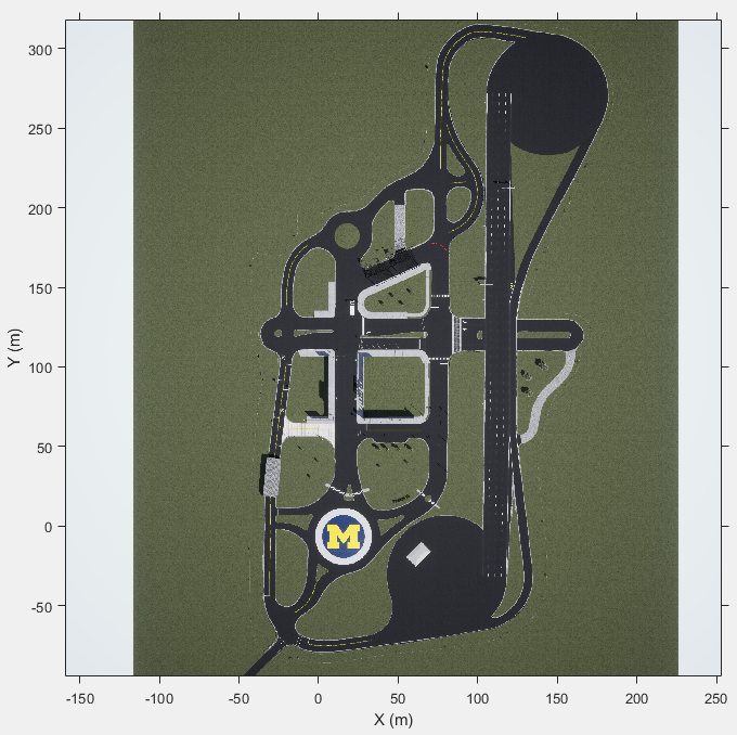 Как и в случае других функций автоматизированной панели инструментов управления, в среде моделирования используется правосторонняя декартова мировая система координат, определенная в ISO 8855. На следующем 2D виде сверху виртуальной сцены Mcity показаны координаты X и Y.