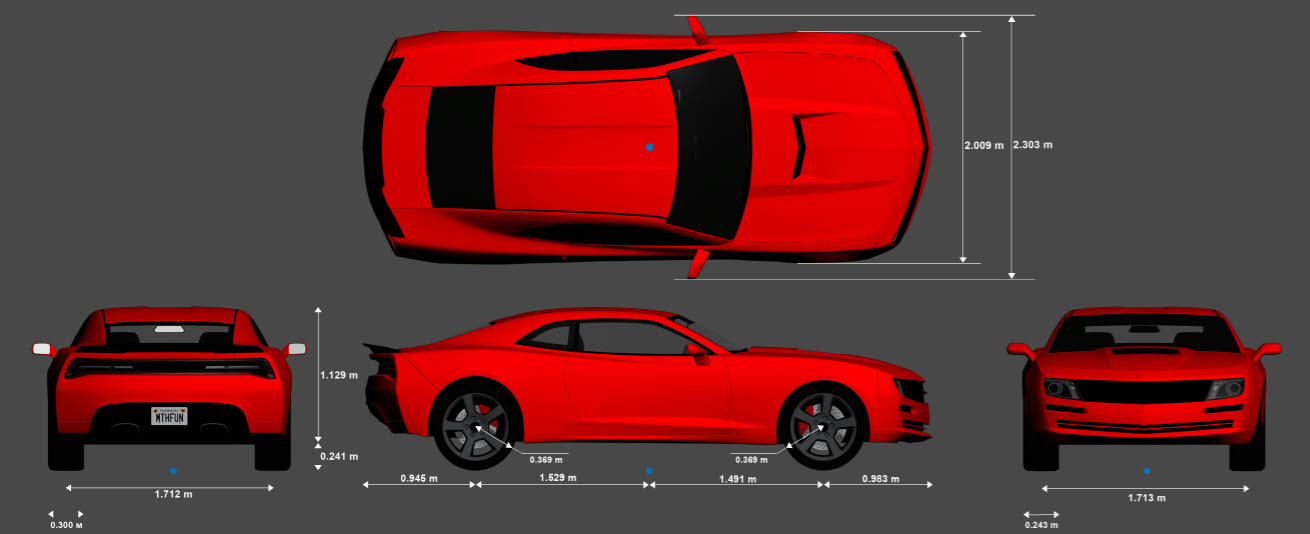 Начало движения транспортного средства находится на земле в геометрическом центре транспортного средства. На этом рисунке синяя точка представляет начало координат транспортного средства.