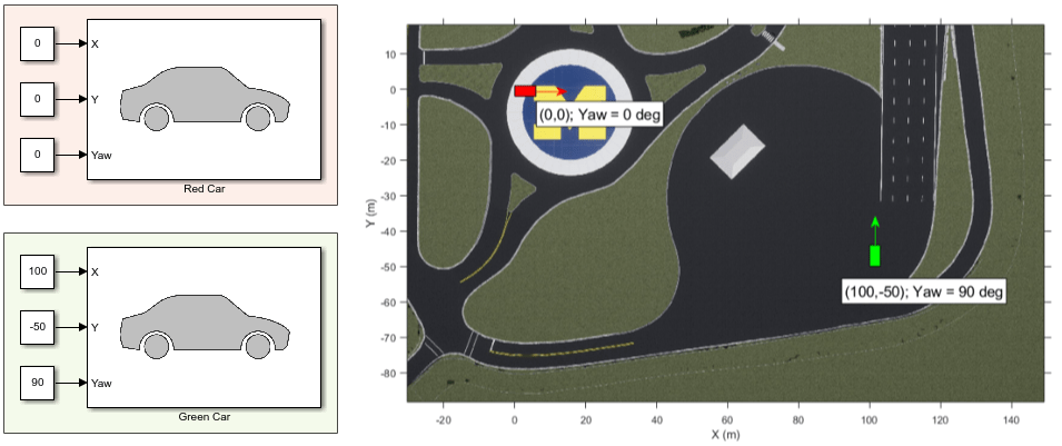 Транспортные средства размещены в мировой системе координат сцен. На рисунке показано, как определение портов X, Y и Yaw в блоках «Имитация 3D транспортного средства» с фюзеляжем определяет их размещение в сцене.