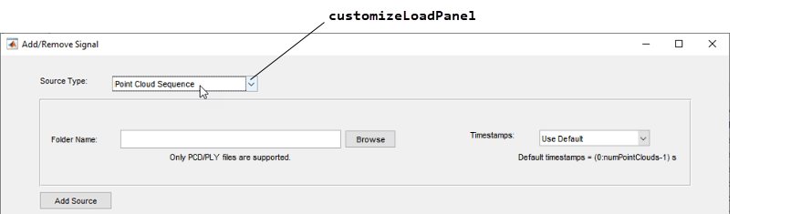 На этом рисунке показана панель загрузки для vision.labeler.loading.PointCloudSequenceSource класс. В списке «Тип источника» при выборе Point Cloud Sequence, приложение вызывает customizeLoadPanel метод и загружает панель для последовательностей облаков точек.