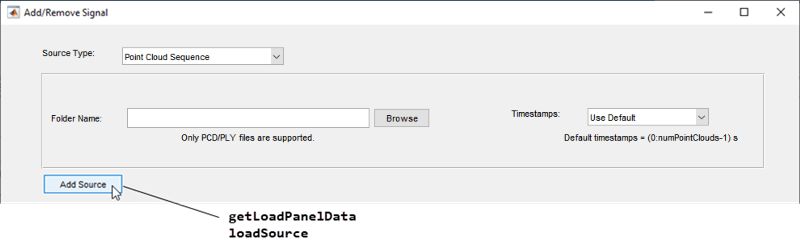 Этот код показывает getLoadPanelData метод для vision.labeler.loading.PointCloudSequenceSource класс. Этот метод устанавливает sourceName на имя, введенное в параметре Folder Name диалогового окна, и sourceParams в пустую структуру. Если параметр Timestamps имеет значение From Workspace и имеет загруженные метки времени, затем приложение заполняет эту структуру этими метками времени.