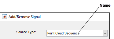 В приложении Ground Truth Labeler при загрузке сигналов из диалогового окна Add/Remove Signal Name строка появляется в качестве опции в параметре «Тип источника». На этом рисунке показаны Name строка для vision.labeler.loading.PointCloudSequenceSource класс.