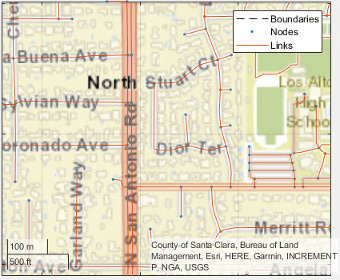 Модель осевой линии дороги представляет топологию сети дорог. Состоит из звеньев, соответствующих улицам и узлам, соответствующим пересечениям и тупикам. Для каждой плитки карты слои в этой модели содержат информацию об этих связях и узлах, такую как геометрия 2-D линий дорожной сети, атрибуты скорости и атрибуты маршрутизации.