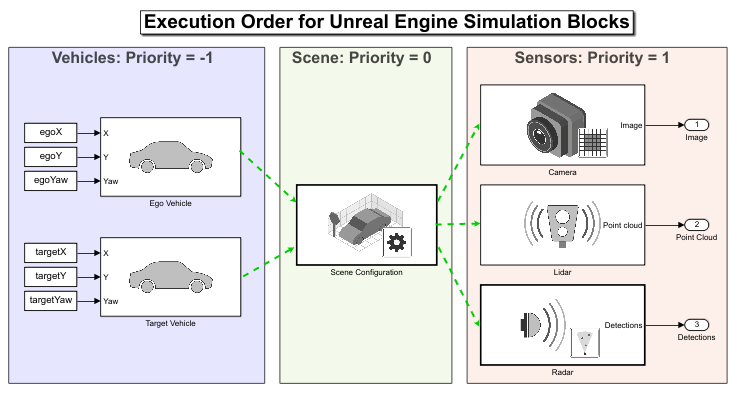 Если датчики не обнаруживают транспортные средства в сцене, возможно, что блоки моделирования Unreal Engine выполняются неправильно. Попробуйте обновить порядок выполнения и смоделировать еще раз. Дополнительные сведения о порядке выполнения см. в разделе Управление и просмотр порядка выполнения (Simulink).