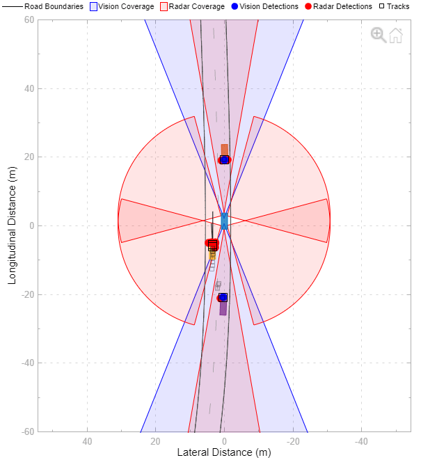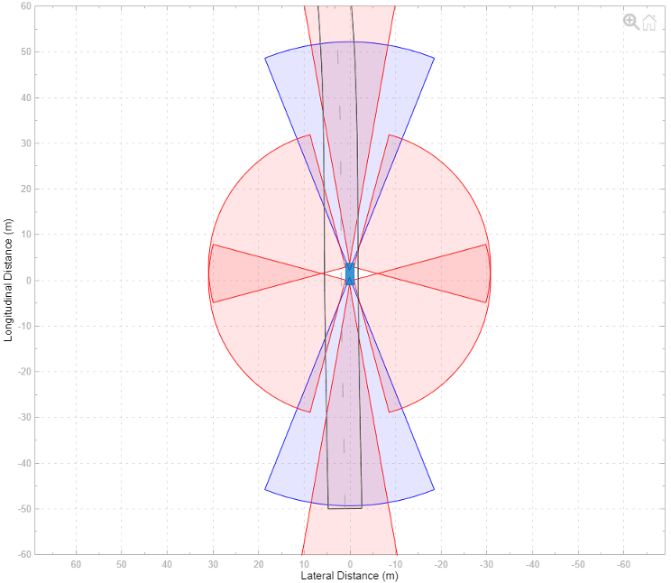После выполнения моделирования измените модель и проверьте, как изменения влияют на визуализацию в области «Птичий глаз». Например, в подсистеме моделирования сенсора модели откройте два блока генератора обнаружения видения. Эти блоки имеют индексы датчиков 1 и 2соответственно. На вкладке Measurements каждого блока уменьшите значение параметра Maximum detection range (m) до 50. Чтобы увидеть, как изменяется покрытие датчика, повторно запустите моделирование.