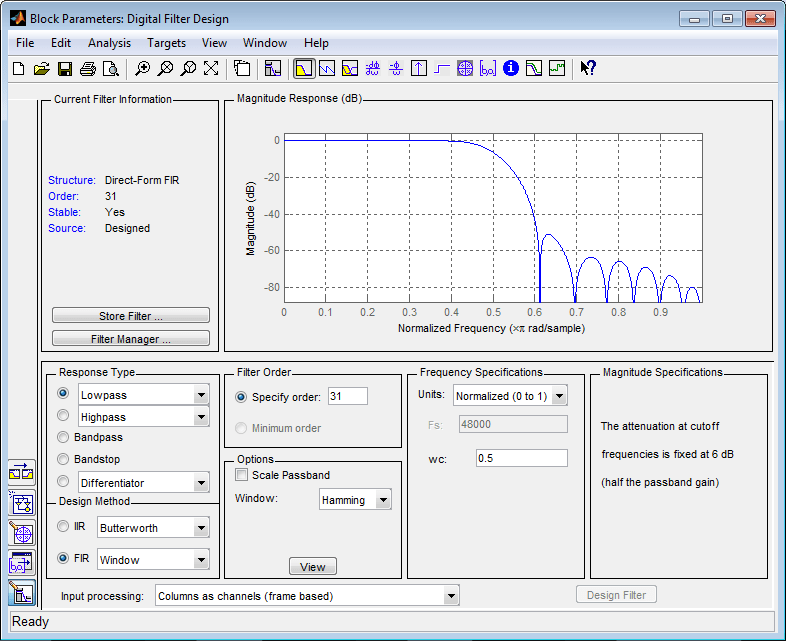 На основе этих параметров блок проектирования цифрового фильтра проектирует низкочастотный КИХ-фильтр с 32 коэффициентами и частотой отсечки 0,5. Блок умножает отклик фильтра во временной области на 32 образца окна Хэмминга.