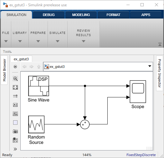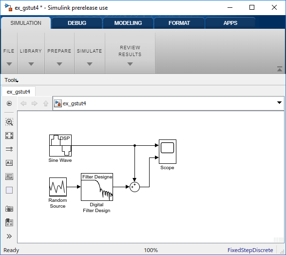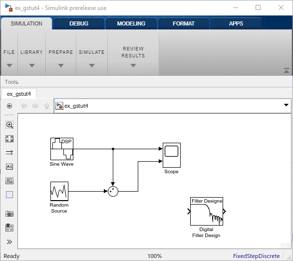 Если модель, созданная в модуле Design a Digital Filter in Simulink, не открыта на рабочем столе, можно открыть эквивалентную модель, введя