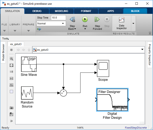 Включите блок проектирования цифрового фильтра в блок-схему, поместив его между блоком случайного источника и блоком суммы.