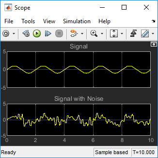 в командной строке MATLAB ®. Эта модель содержит блок Scope, который отображает исходную синусоидальную волну и синусоидальную волну с добавленным белым шумом.