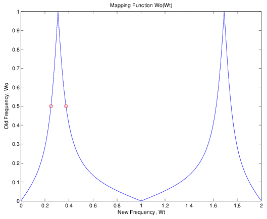 Wo = 0.5; Wt = [0.25, 0.375]; [AllpassNum, AllpassDen] = allpasslp2bs(Wo, Wt); [h, f] = freqz(AllpassNum, AllpassDen, 'whole'); plot(f/pi, abs(angle(h))/pi, Wt, Wo, 'ro'); title('Mapping Function Wo(Wt)'); xlabel('New Frequency, Wt'); ylabel('Old Frequency, Wo');