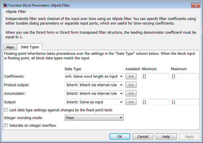 Панель Типы данных (Data Types) диалогового окна Блок фильтра Allpole (Allpole Filter) отображается следующим образом.