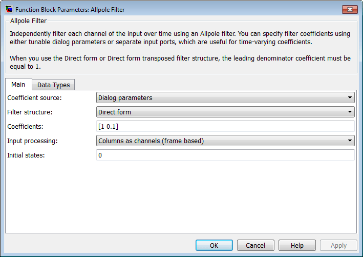 Блок Allpole Filter независимо фильтрует каждый канал входного сигнала указанным allpole фильтром. Блок может реализовывать статические фильтры с фиксированными коэффициентами, а также изменяющиеся во времени фильтры с коэффициентами, изменяющимися во времени. Во время моделирования можно настроить коэффициенты статического фильтра.