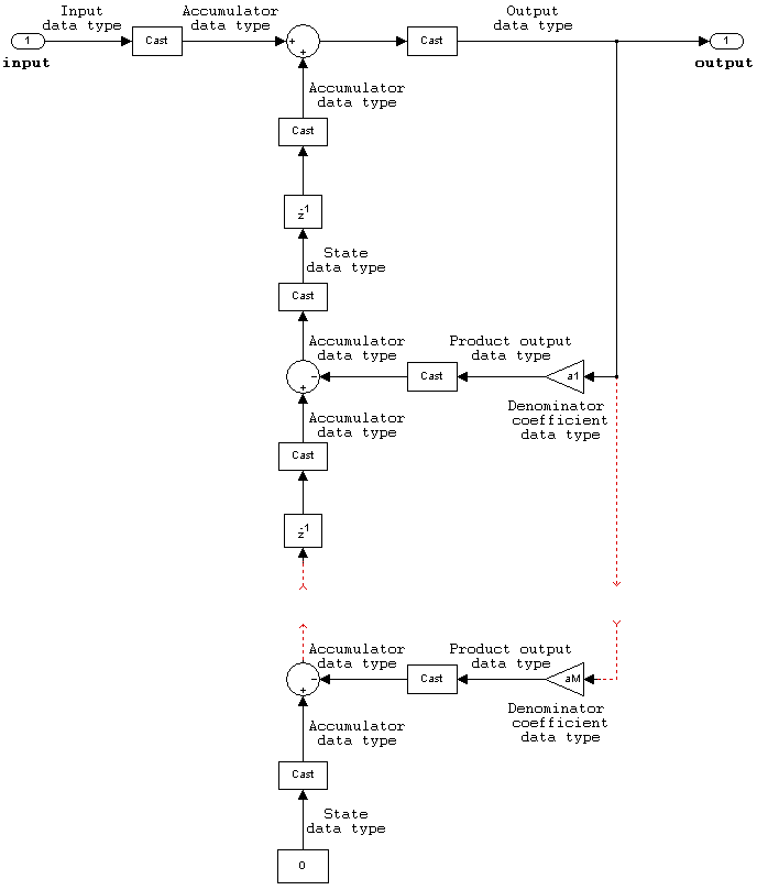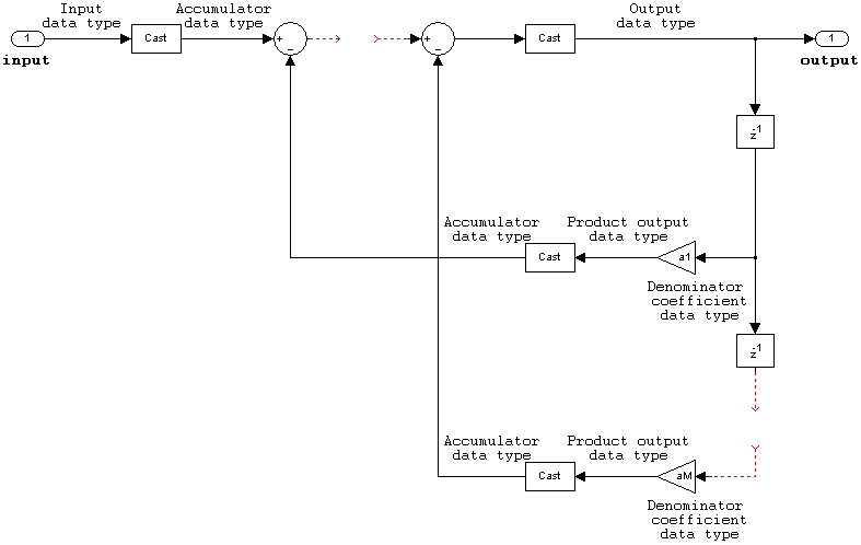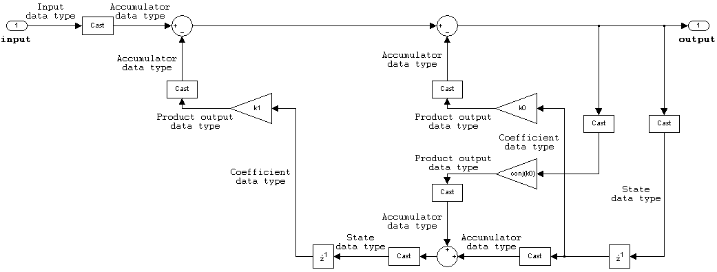 На следующих диаграммах показана структура фильтра и типы данных, используемые в блоке фильтра Allpole для сигналов с фиксированной точкой.