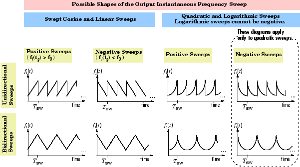 Когда вы хотите линейно swepted chirp сигнал, мы рекомендуем использовать Linear свип частоты. Хотя Swept cosine свип частоты также дает линейно свитый чирп-сигнал, выходной сигнал может иметь неожиданное частотное содержание.