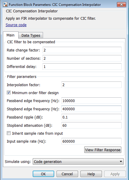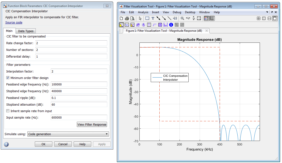 Открывает инструмент визуализации фильтра FVTool и отображает отклик величины/фазы интерполятора компенсации CIC. Ответ основан на параметрах диалогового окна блока. Изменения, внесенные в эти параметры, обновляют FVTool.