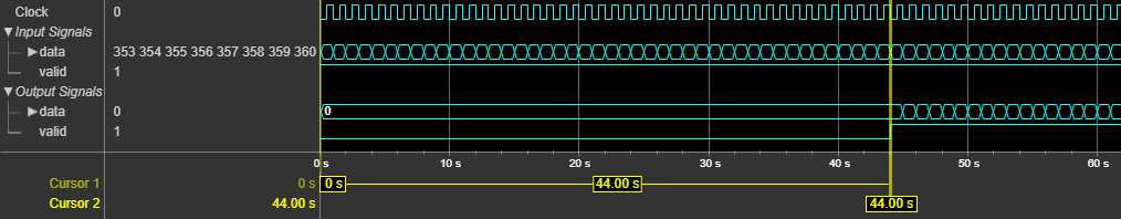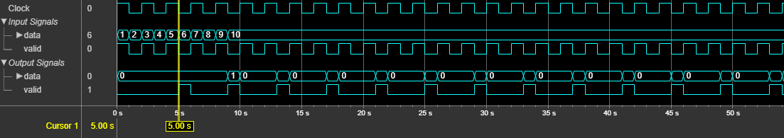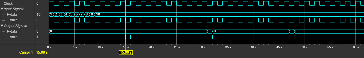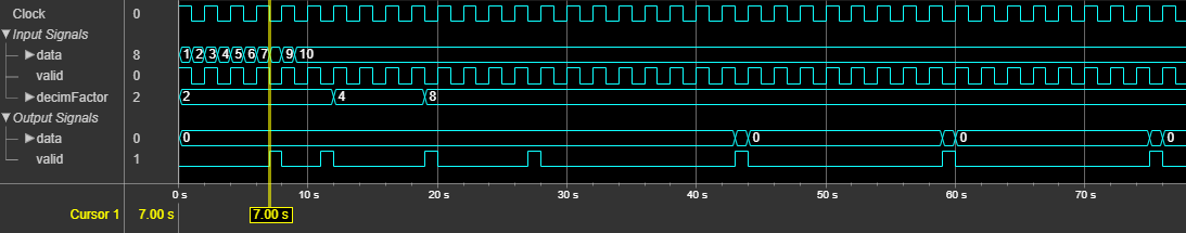 На этом рисунке показан выходной сигнал блока для конфигурации по умолчанию (т.е. с фиксированной скоростью прореживания и значениями R, M и N 2, 1 и 2 соответственно). Блок возвращает действительные выходные данные в каждом втором цикле на основе фиксированного значения параметра коэффициента прореживания (R), равного 2. Задержка блока составляет 5 тактовых циклов и вычисляется как 3 + N, где N - количество секций.