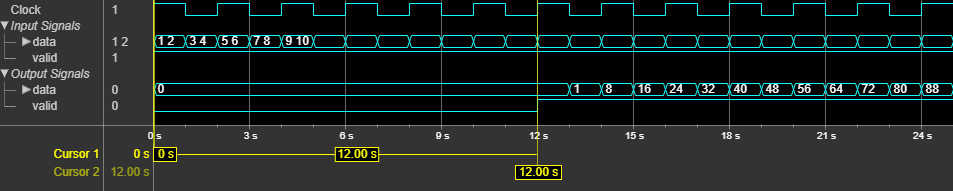 На этом рисунке показан выход блока для ввода вектора двухэлементного столбца с конфигурацией по умолчанию (то есть с фиксированной скоростью прореживания и значениями R, M и N 2, 1 и 2 соответственно). Задержка блока составляет 12 тактовых циклов.