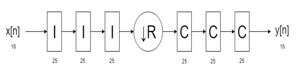 Блок оптимизации децимации HDL CIC имеет структуру фильтра CIC, показанную на этом рисунке. Структура состоит из N секций каскадных интеграторов, коэффициента изменения скорости R и N секций каскадных гребенчатых фильтров [1].