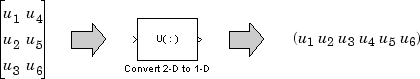 Блок «Преобразовать 2-D в 1-D» изменяет форму матрицы M-by-N на 1-D вектор длиной M * N.