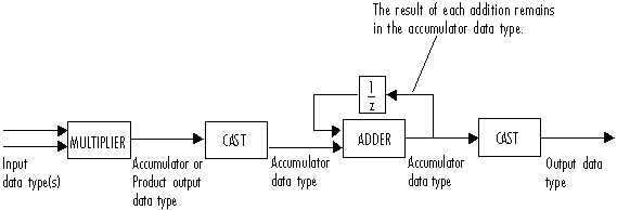 Схематическое представление использования типа данных накопителя в этом блоке см. в разделе Преобразование фиксированных точек в расширенных возможностях.