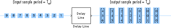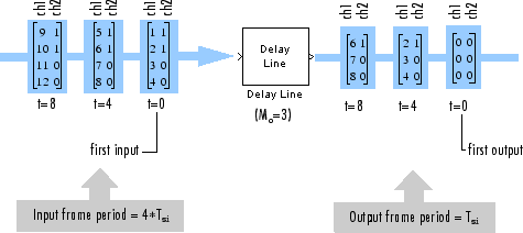 Первый выходной кадр в этом примере обусловлен задержкой блока линии задержки; все нули, поскольку параметр Initial conditions имеет нулевое значение. Поскольку размер входного кадра 4 больше, чем размер выходного кадра 3, только последние три выборки в каждом входном кадре распространяются на соответствующий выходной кадр. Периоды кадров на входе и выходе одинаковы, и период выходной выборки равен Tsi (Mi/Mo), или 4/3 периода входной выборки.