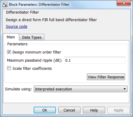 Блок дифференцирующего фильтра применяет к входному сигналу полнополосный дифференцирующий фильтр для дифференцирования всех его частотных компонентов. Блок использует конструкцию эквриппл-фильтра FIR для проектирования фильтра дифференциатора. Идеальной частотной характеристикой дифференциатора является jλ −π≤ω≤π .