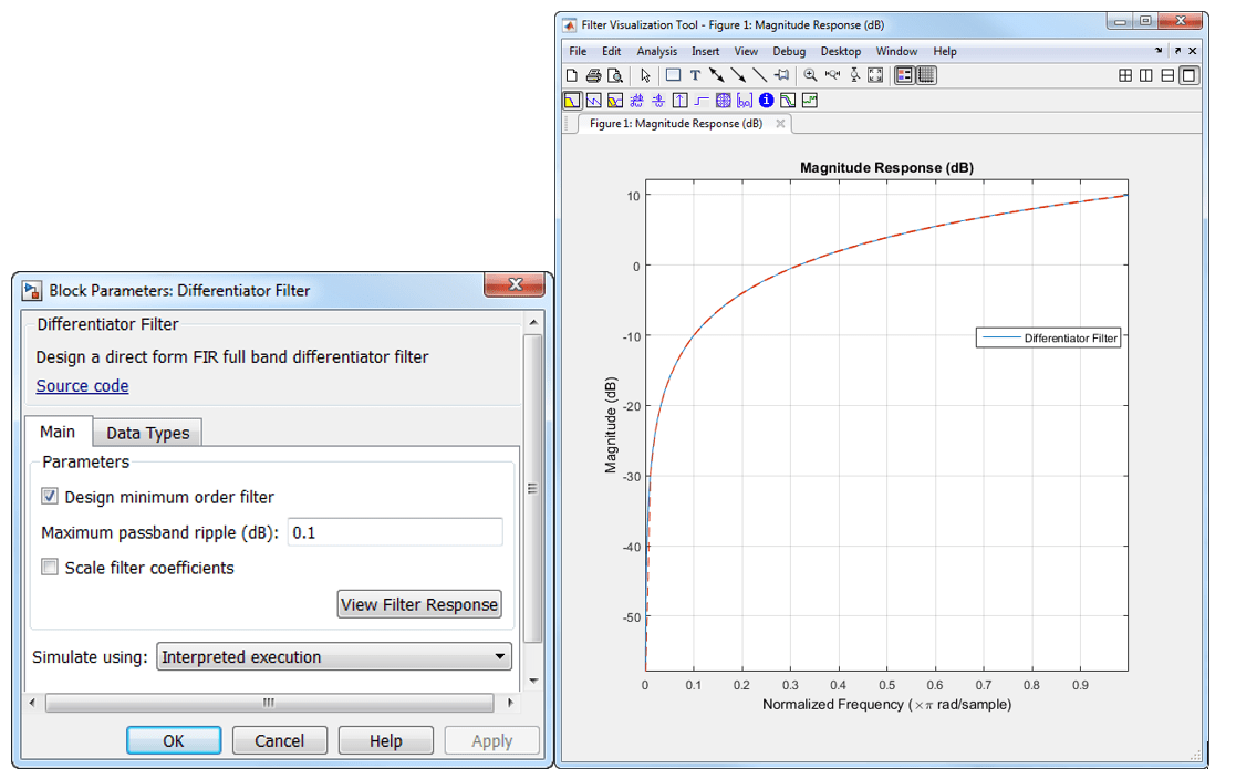 Открывает инструмент визуализации фильтра (fvtool) и отображает величину и фазовую характеристику блока фильтра дифференциатора. Ответ основан на параметрах диалогового окна блока. Изменения, внесенные в эти параметры, обновляют FVTool.