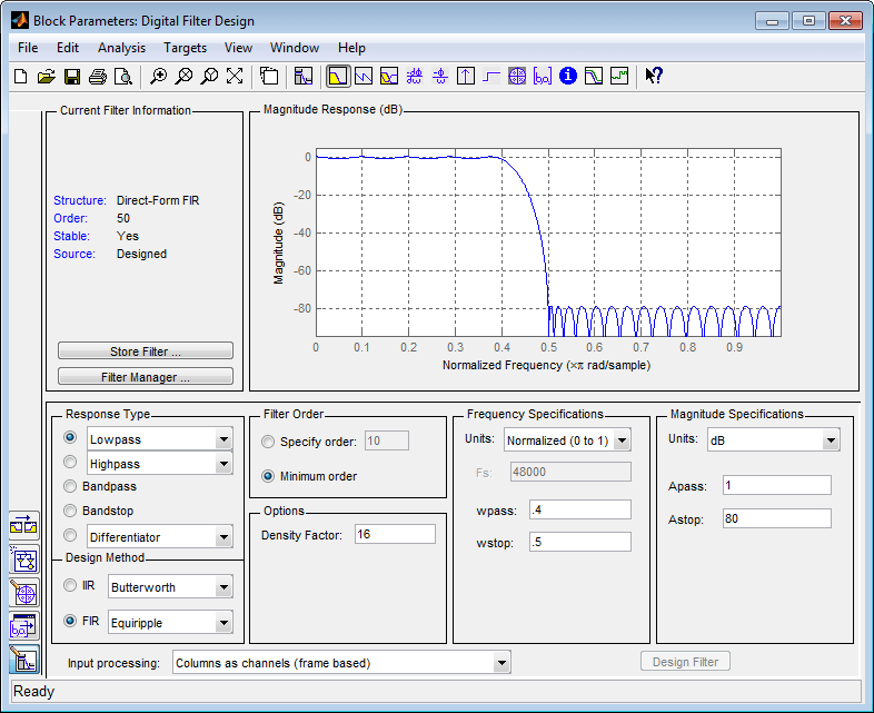 Необходимо указать, выполняет ли блок обработку входных данных на основе кадров или образцов, установив параметр обработки Input. Блок применяет указанный фильтр к каждому каналу дискретно-временного входного сигнала и выдает результат. Выходы блока численно совпадают с выходами дискретного фильтра FIR или блока биквад-фильтра и MATLAB