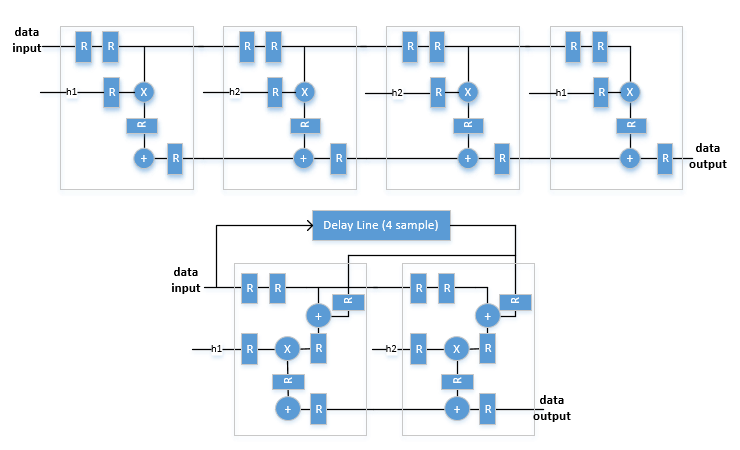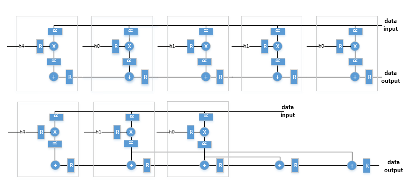 Все три структуры оптимизируют аппаратные ресурсы путем совместного использования множителей для симметричных или антисимметричных фильтров. Параллельные реализации также удаляют множители для нулевых коэффициентов, таких как в полуполосных фильтрах и преобразованиях Гильберта.